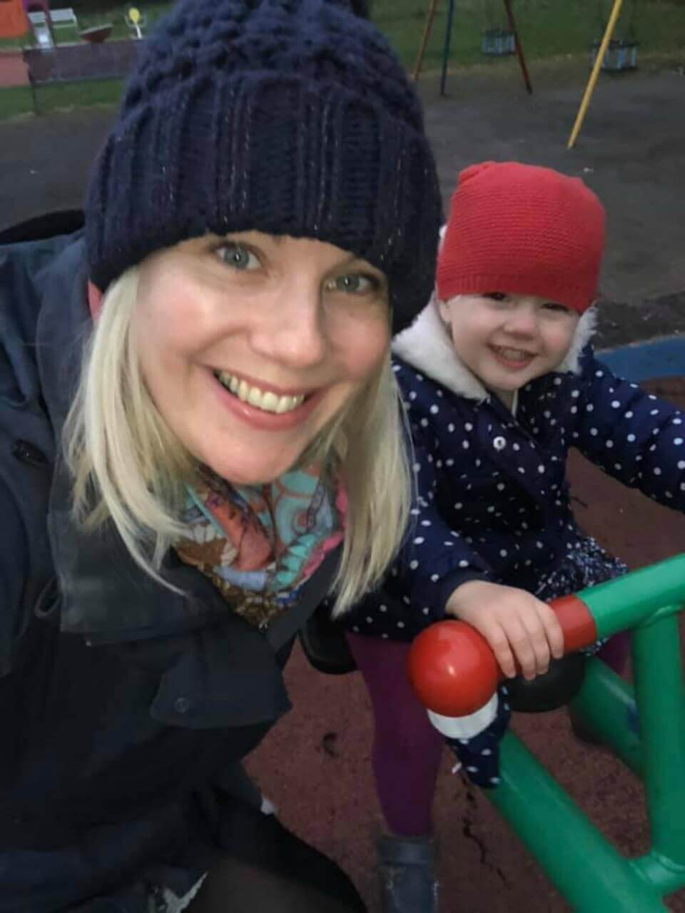 Siobhan is wasting no time while she is at the playground with her daughter. She says “Getting in some squats at the park!”.