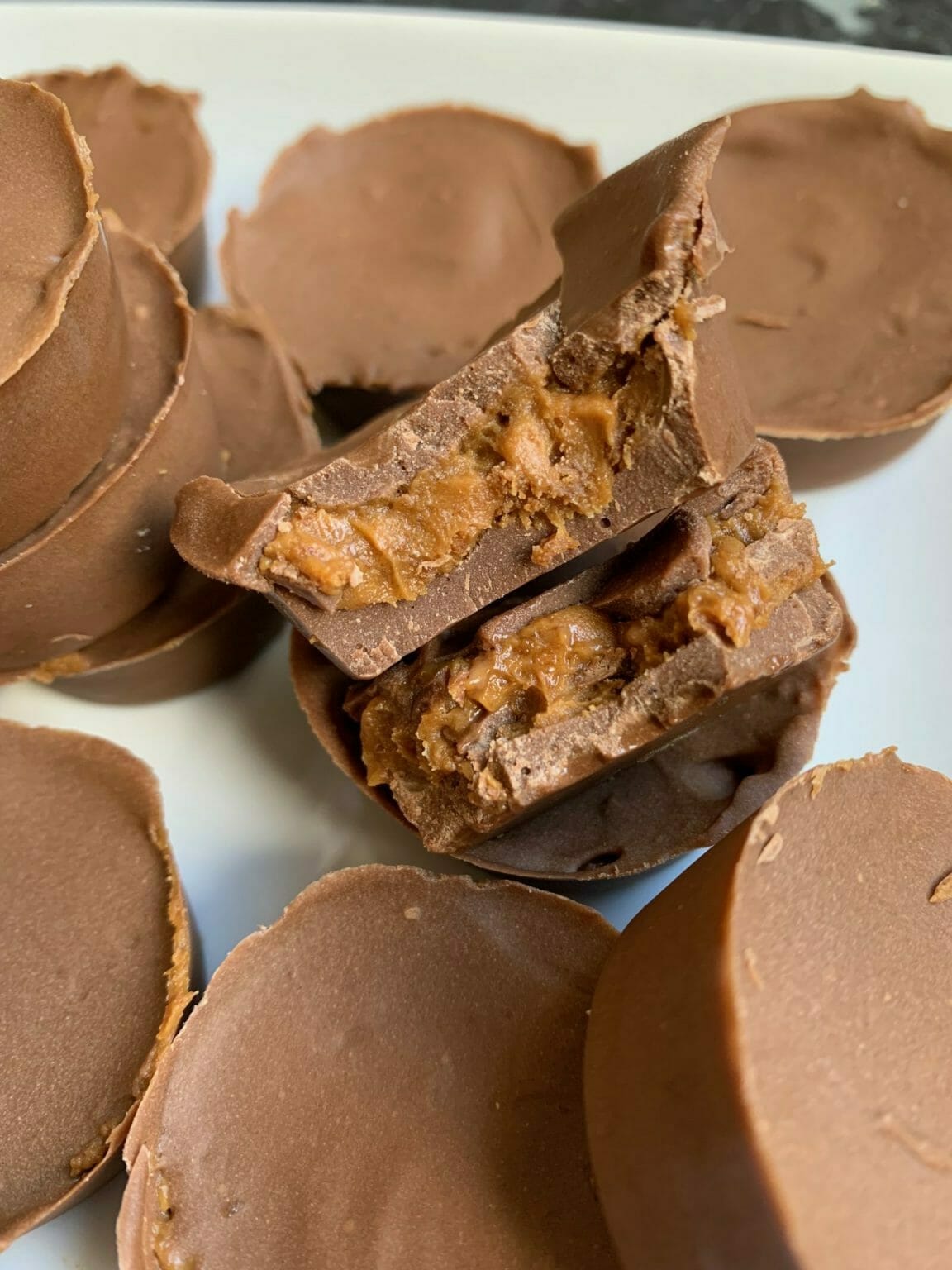 - Using a mini silicone tray (with holes about the size of 50 cent pieces) and coat the bottom and sides of 18 holes – This takes up about 1 -1.5 teaspoons of melted chocolate. The best method for this is just using your first finger in circular motions to make sure everywhere is coated.