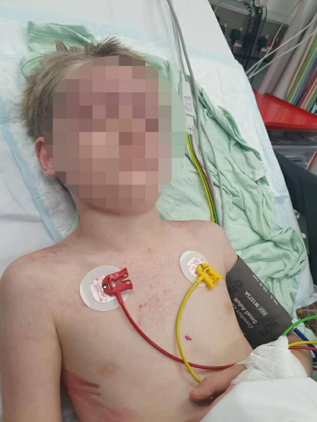 Sharing pictures of her son in hospital and the visible injuries he sustained, she wrote: “Safety warning to all parents!! Please read whole story – on Sunday our son was using a hot tub when he was sucked under by a filter inlet within the tub.