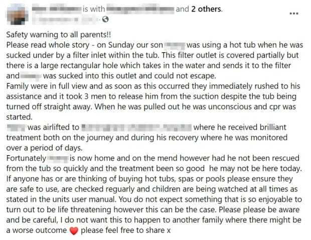 Posting to Facebook, the mum warned of the ‘life-threatening’ dangers hot tubs can have, as she urged other parents to watch their kids at all times when using a hot tub, spa or pool.