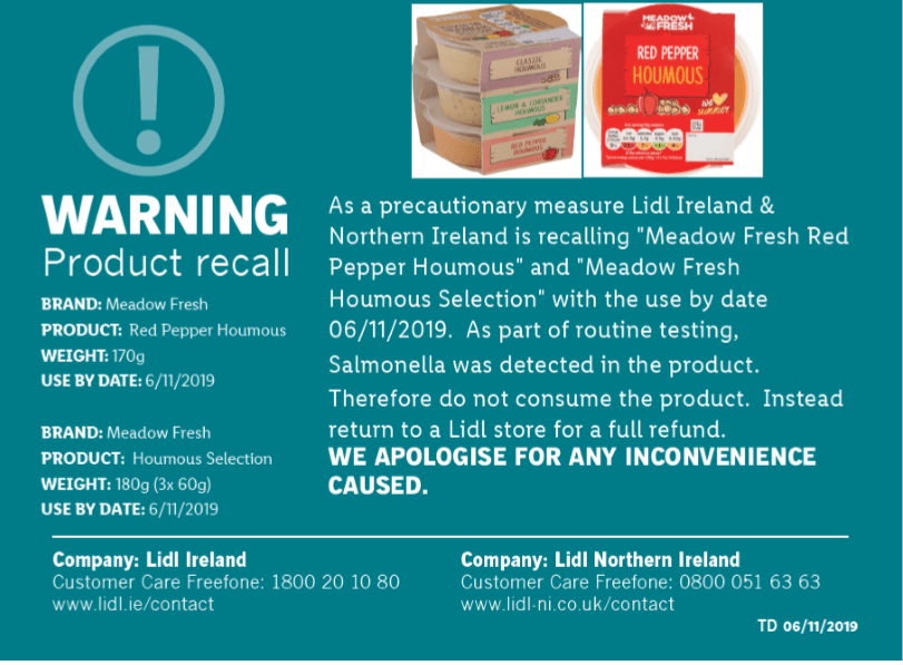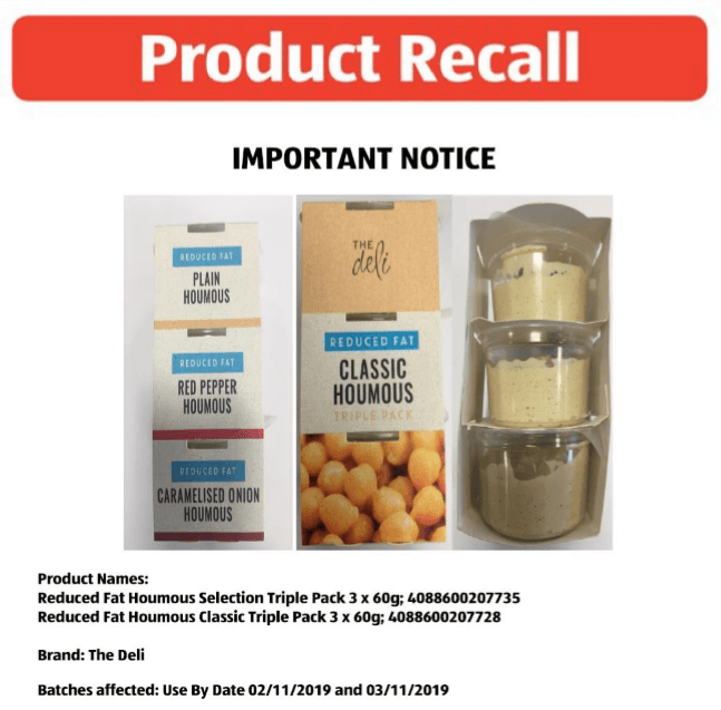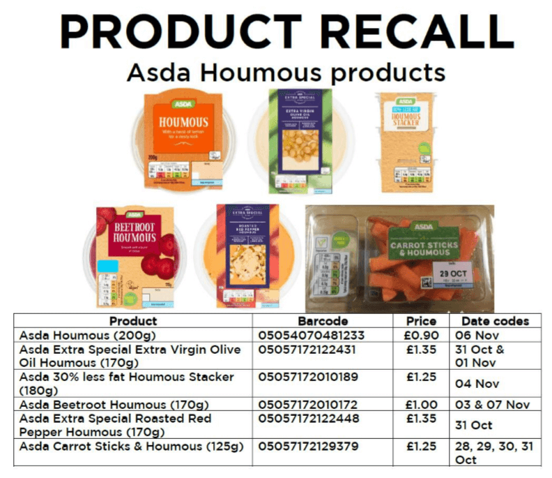 Nearly 20 types of houmous from stores including Sainsbury’s Morrisons, Aldi, Lidl and Asda have been urgently recalled over fears it could be contaminated with salmonella.
