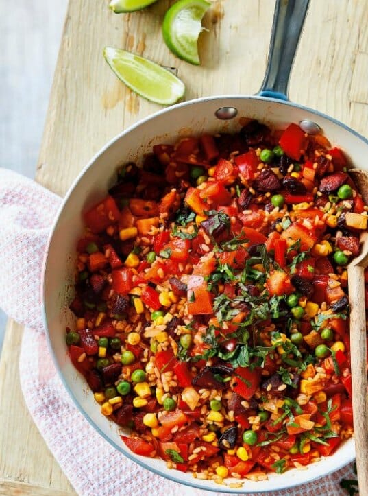 - Add the onion to the pan and cook for 2 minutes or until it starts to turn golden. Add the tomato, peas, corn, capsicum and paprika and toss to combine. Cook for 3 minutes or until the vegetables are just tender.