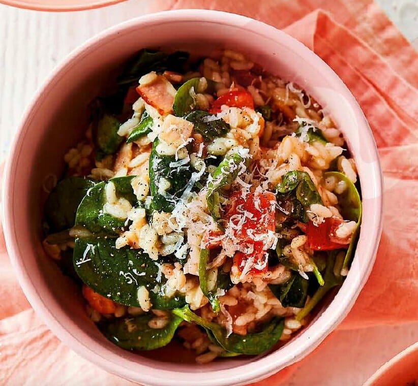 - Add the tomato and spinach with the last addition of stock, then cover with a lid and reduce to a gentle simmer for 10 minutes or until the rice is cooked through and tender (add a little more stock if needed).