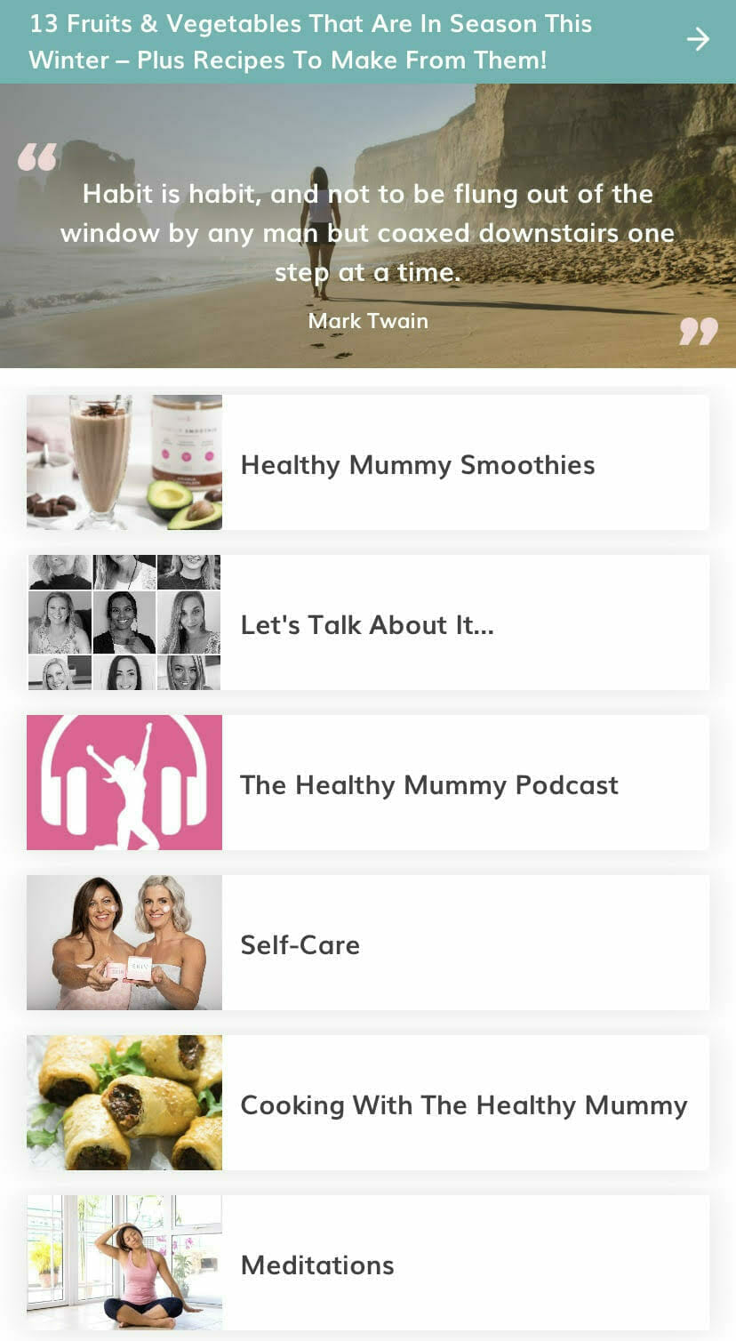 Wellbeing & Mindset App: Health and Fitness is not just about the food we eat and exercise we do, our mindset and overall wellbeing plays an integral part. The Wellness area in the Healthy Mummy App covers everything from psychology and aspects surrounding self sabotage, motivation and mum guilt, to practical cooking support, entertaining podcasts and how to focus on self care.