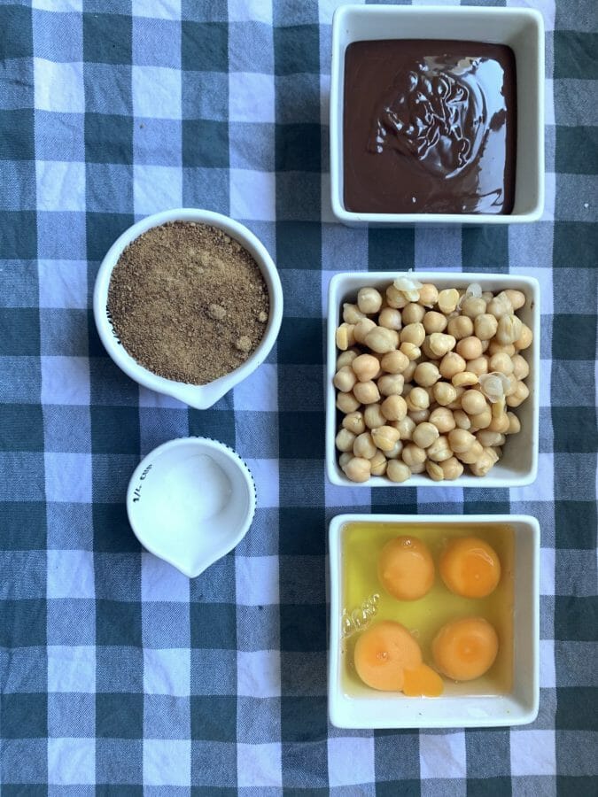 - Put eggs, coconut sugar, chickpeas, baking powder and melted chocolate into a blender and blend well.