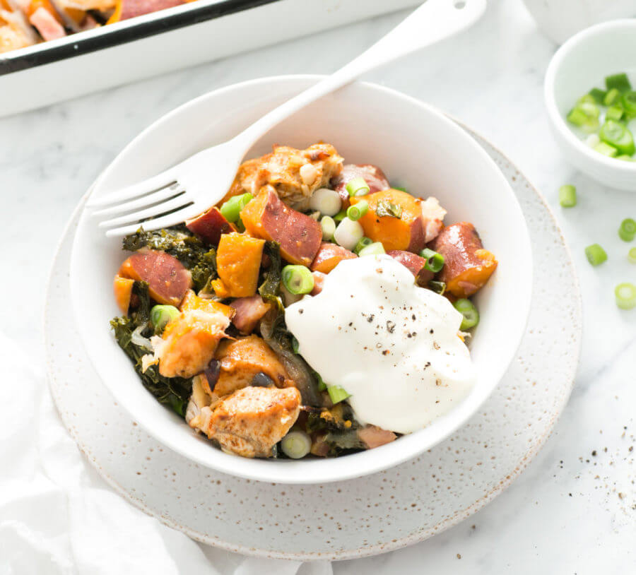 - Drizzle oil over everything and bake uncovered for about 30 minutes or until sweet potato and chicken are cooked through.
