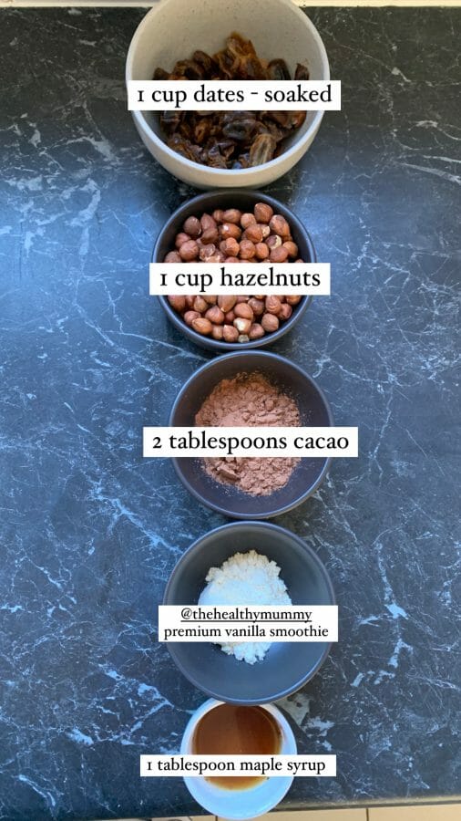 Let your food processor do all the work with this recipe! Just throw in your soaked dates, hazelnuts, cacao powder, Chocolate Smoothie mix and maple syrup and blend together until all mixed up. Add a little water if need be to loosen the mixture.