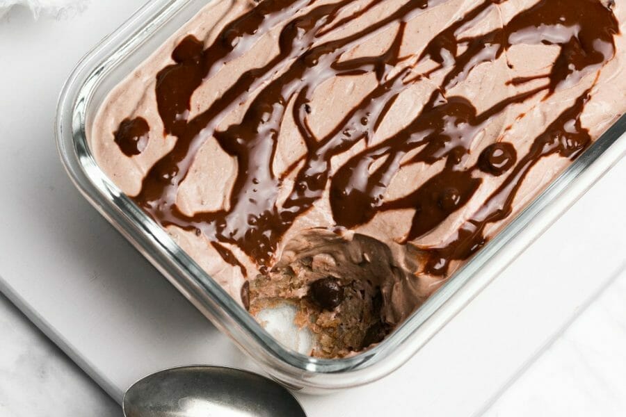 - Melt the remaining chocolate chips in short increments in the microwave then drizzle over the yoghurt layer.