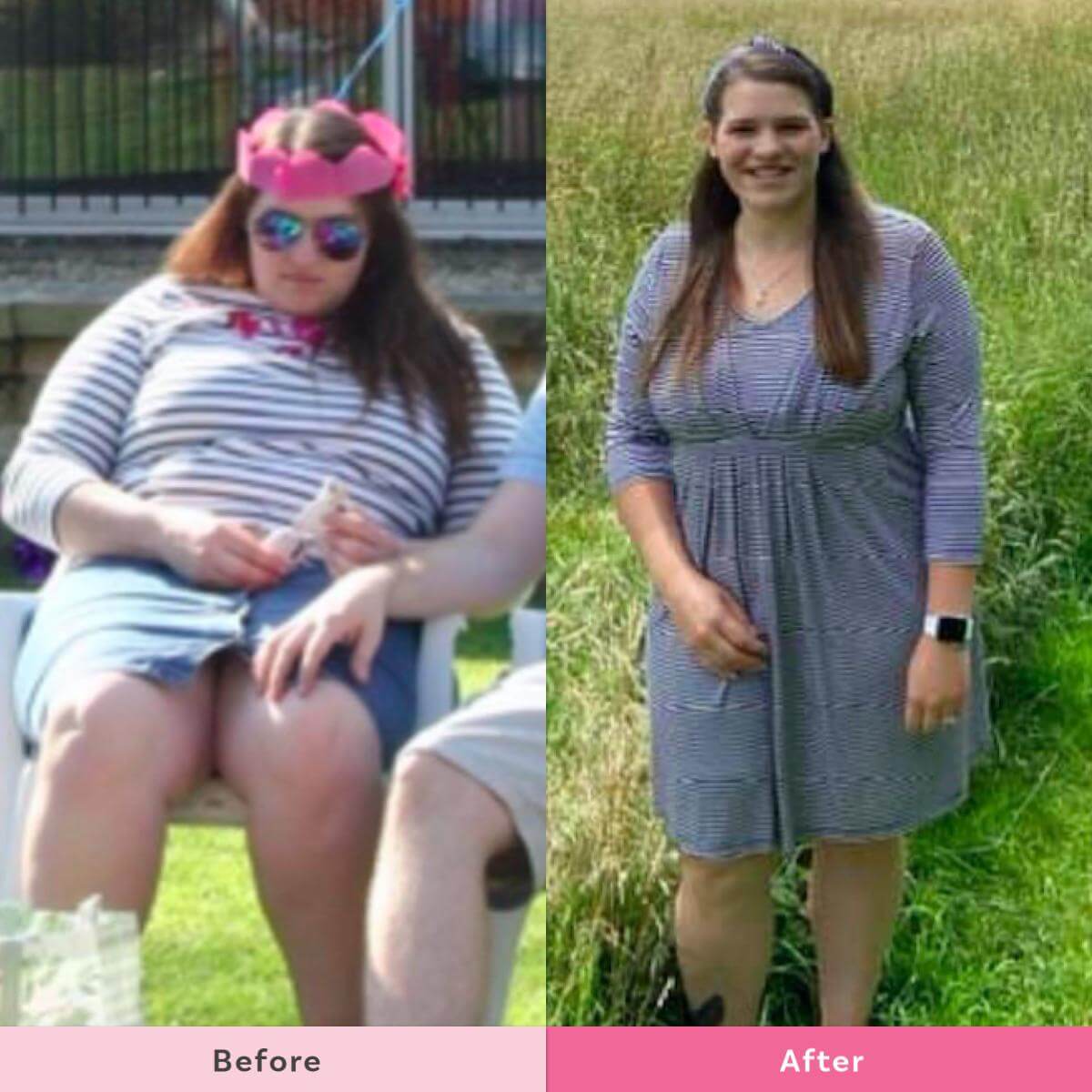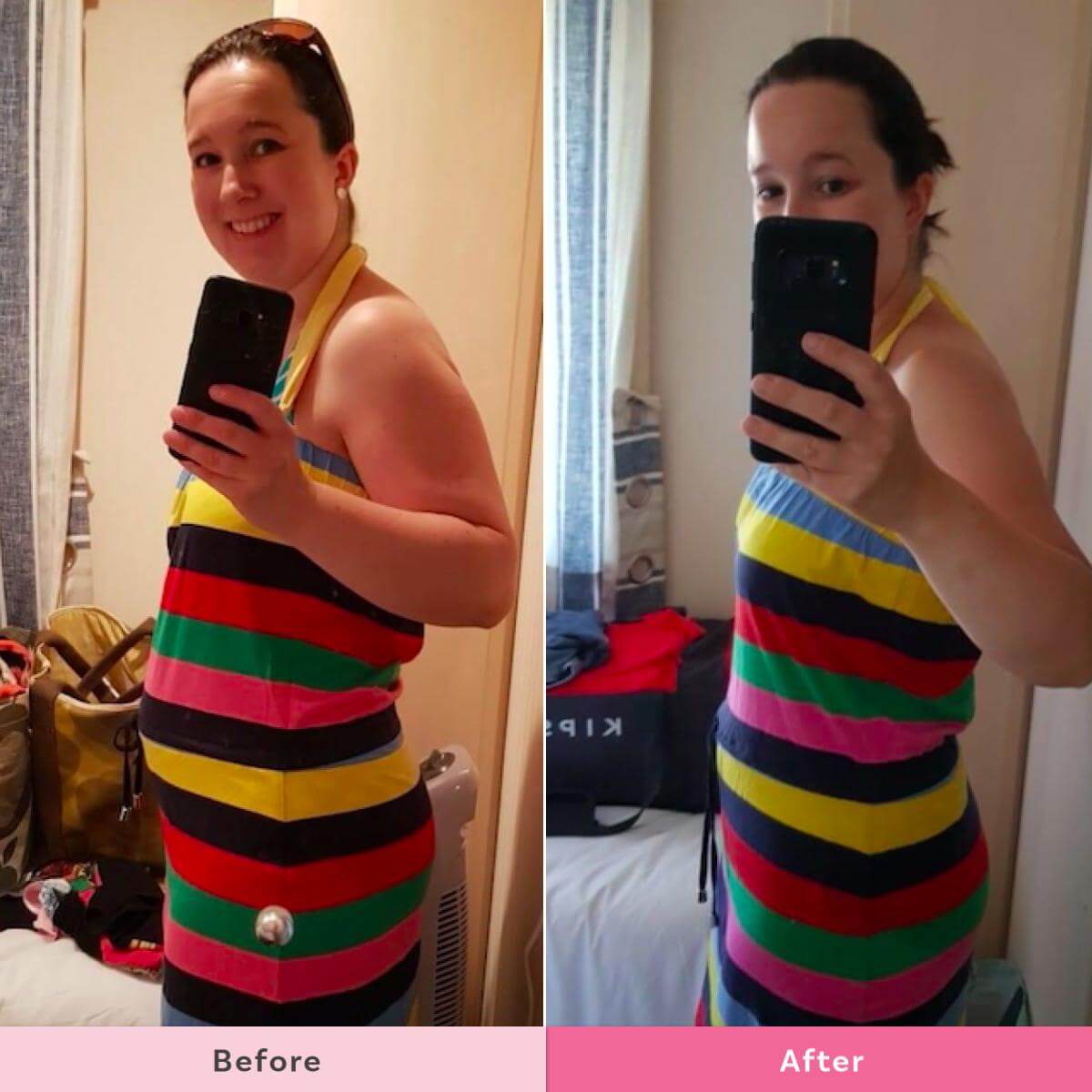 Sarah says “Photos a year apart. Same dress but the swimsuit underneath is a size smaller than last year. I’m not weighing myself this month so I’m not sure of the weight difference but the visual difference is there!