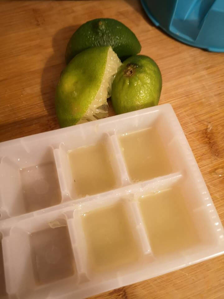 Maria squeezes the lemons and limes and freezes them in ice cube trays for future use.
