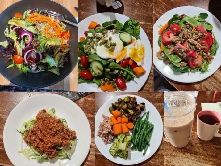 “I had meat and salad, salad and tuna, salad egg for dinner and Fruit/yoghurt/handful of nuts for a snack.”